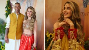 वहीं अगर शिखर धवन के लुक की बात करें तो वह भी ट्रेडिशनल अंदाज में नजर आए। व्हाइट कलर के सलवार-कुर्ते के साथ येलो नेहरू जैकेट पहने धवन बेहद सादगी और स्टाइल के साथ दिखाई दिए। तस्वीरों में कपल की केमिस्ट्री साफ झलक रही है। दोनों एक-दूसरे के साथ बेहद खुश नजर आए और समारोह के दौरान रोमांटिक पलों की झलक भी देखने को मिली।